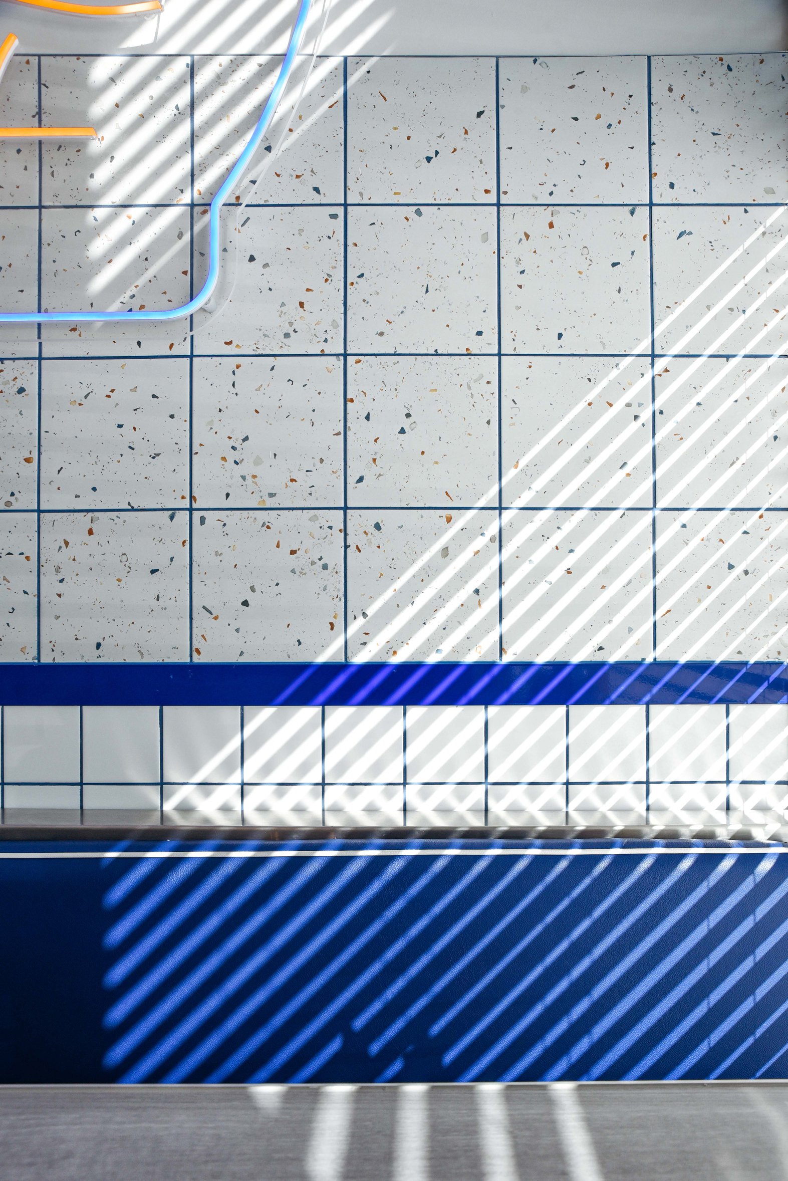A tiled wall with diagonal shadows created by sunlight through a slatted structure, featuring white, speckled, and blue tiles in an indoor or outdoor setting.