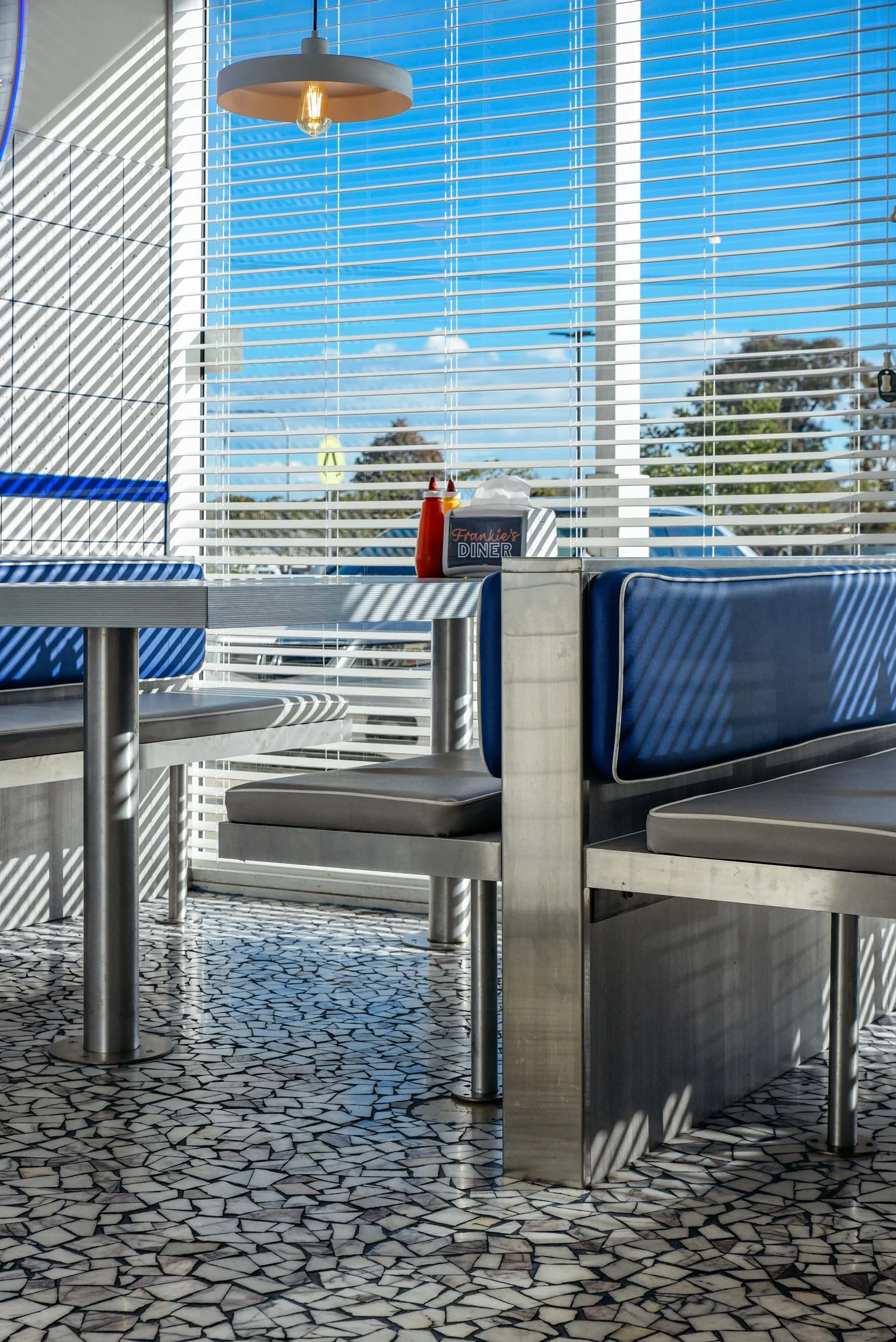 Interior of a diner with blue booths, a table with napkins and condiments, and patterned tiled floor, with sunlight and shadows through window blinds.