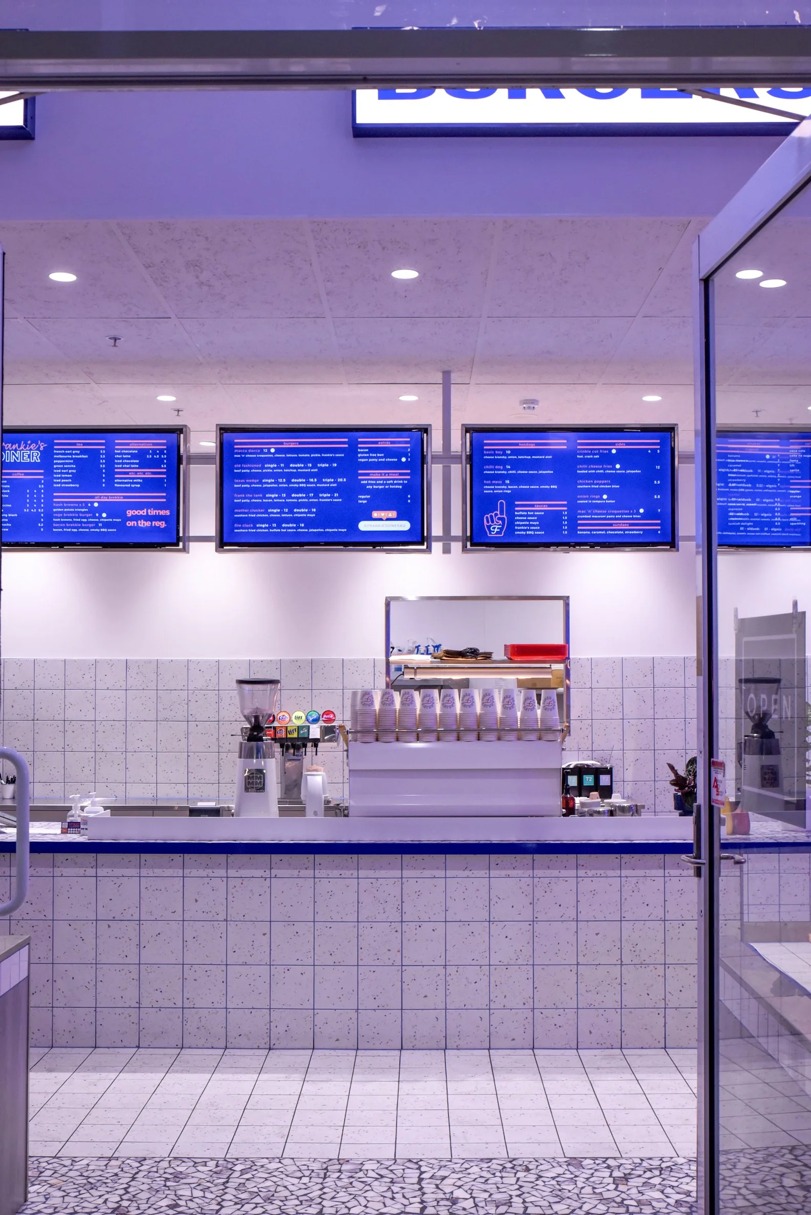 Interior of a retro-style diner with a tiled counter, stack of cups, small shelves, and neon signs on the wall, illuminated with purple and blue lighting.