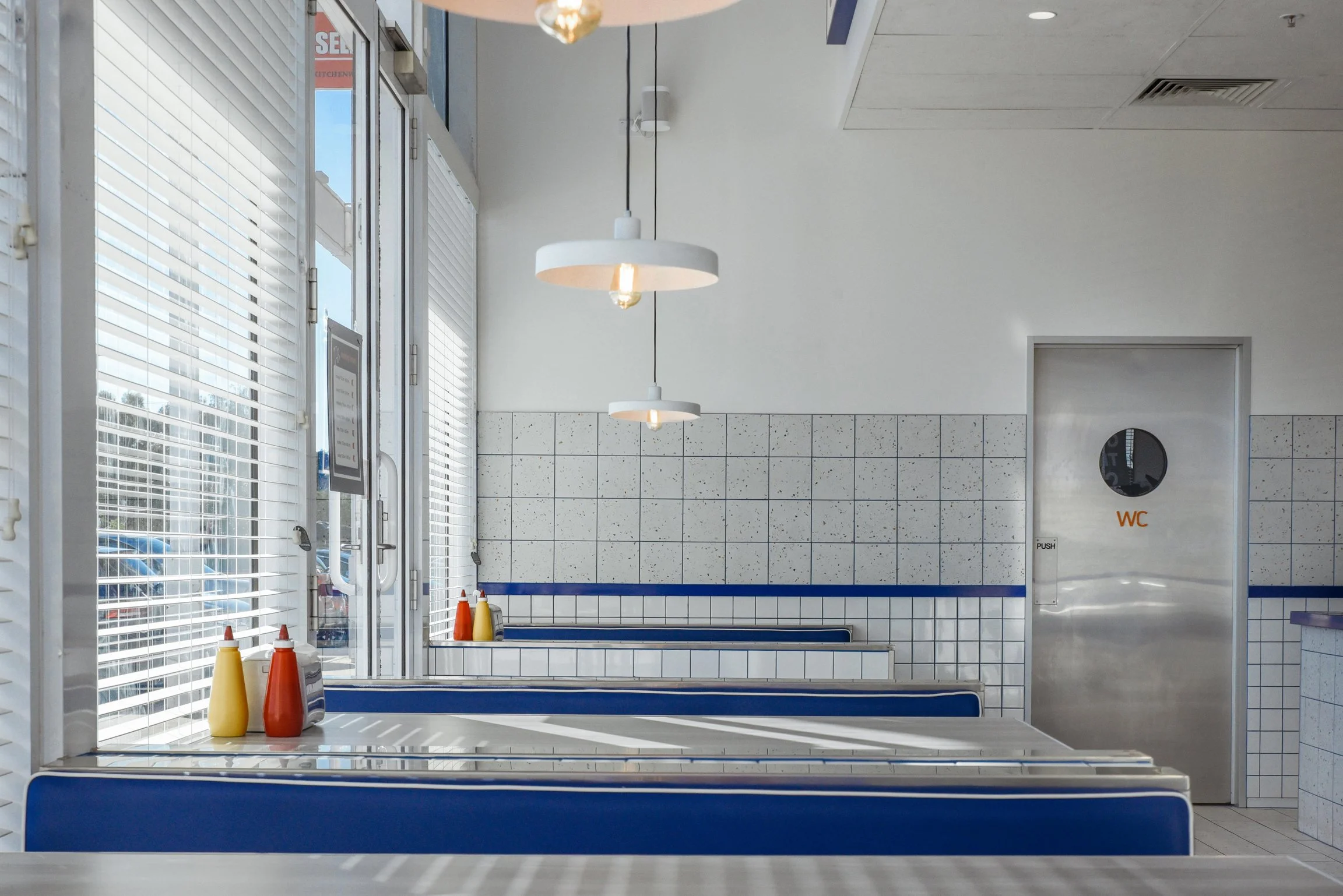 Interior of a fast-food restaurant with white tiled walls, hanging pendant lights, and a door labeled 'WC' for restrooms. Blue booths and condiment bottles are on the tables near the windows.