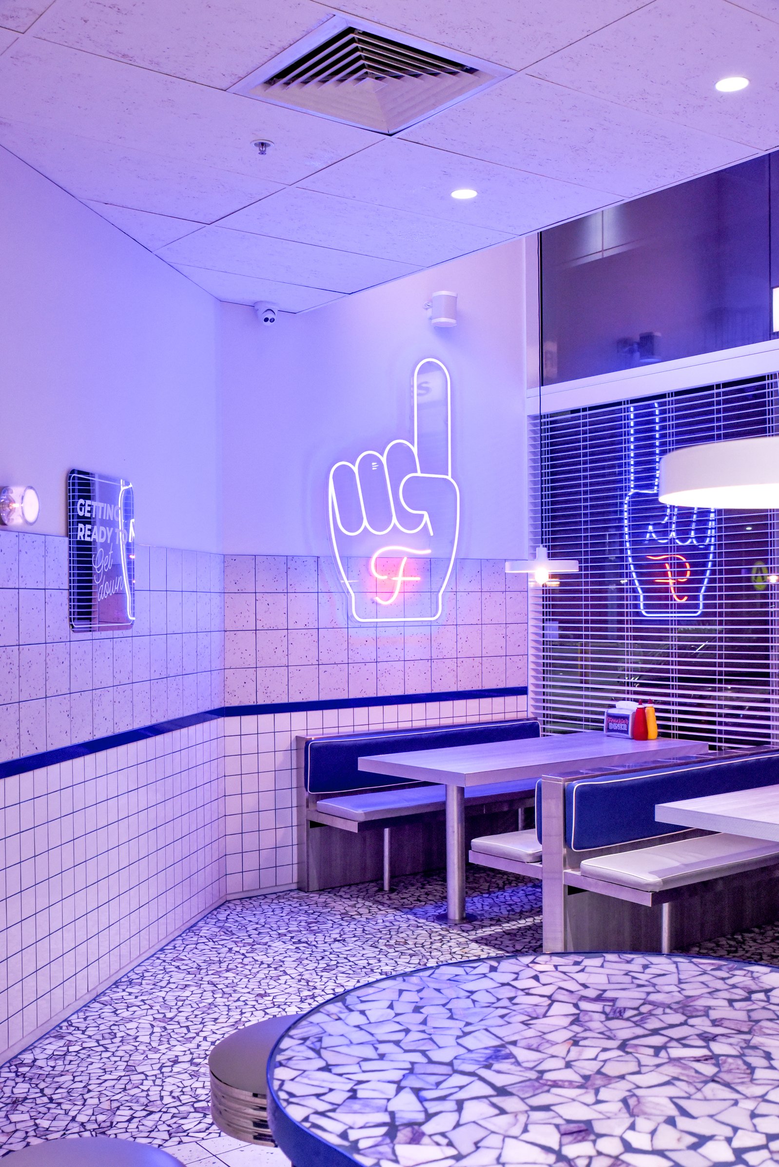 Empty interior of a retro-style American diner with white tiled walls, blue accents, lined-up booths, condiment bottles, and a neon sign of a fist holding a French fry.