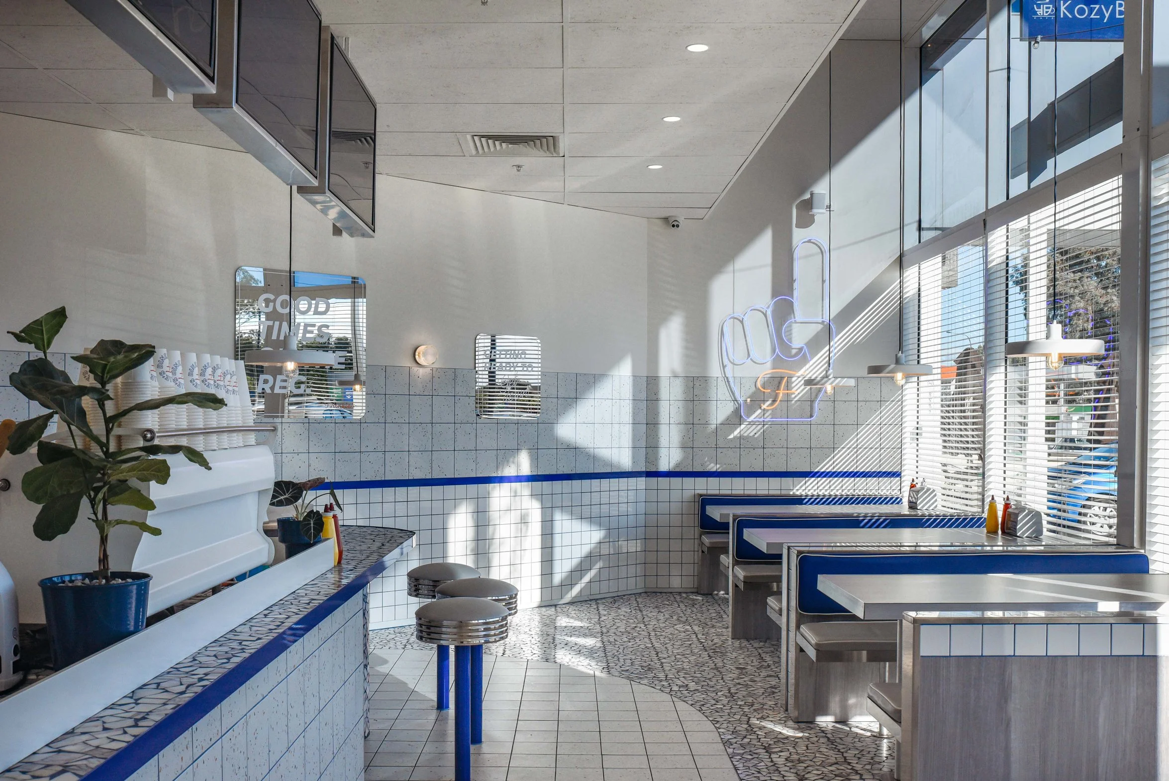 Empty retro-style diner with white and blue decor, booths along windows with blinds, neon sign of a hand with a finger pointing up, and sunlight streaming through windows.