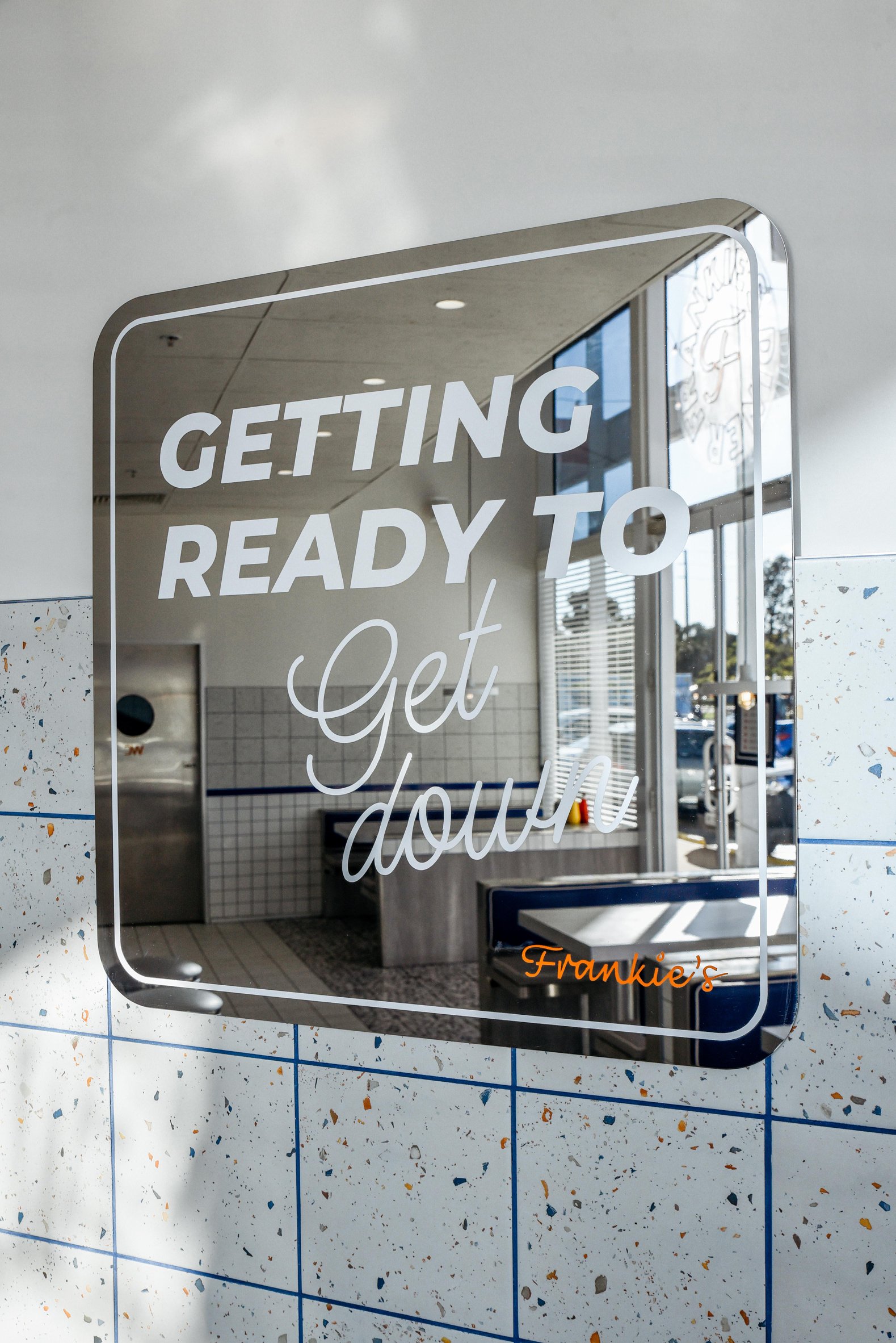 Mirror with the text 'Getting ready to get down' written on it, inside a fast-food restaurant, with tiled walls and a window showing the outside parking lot.