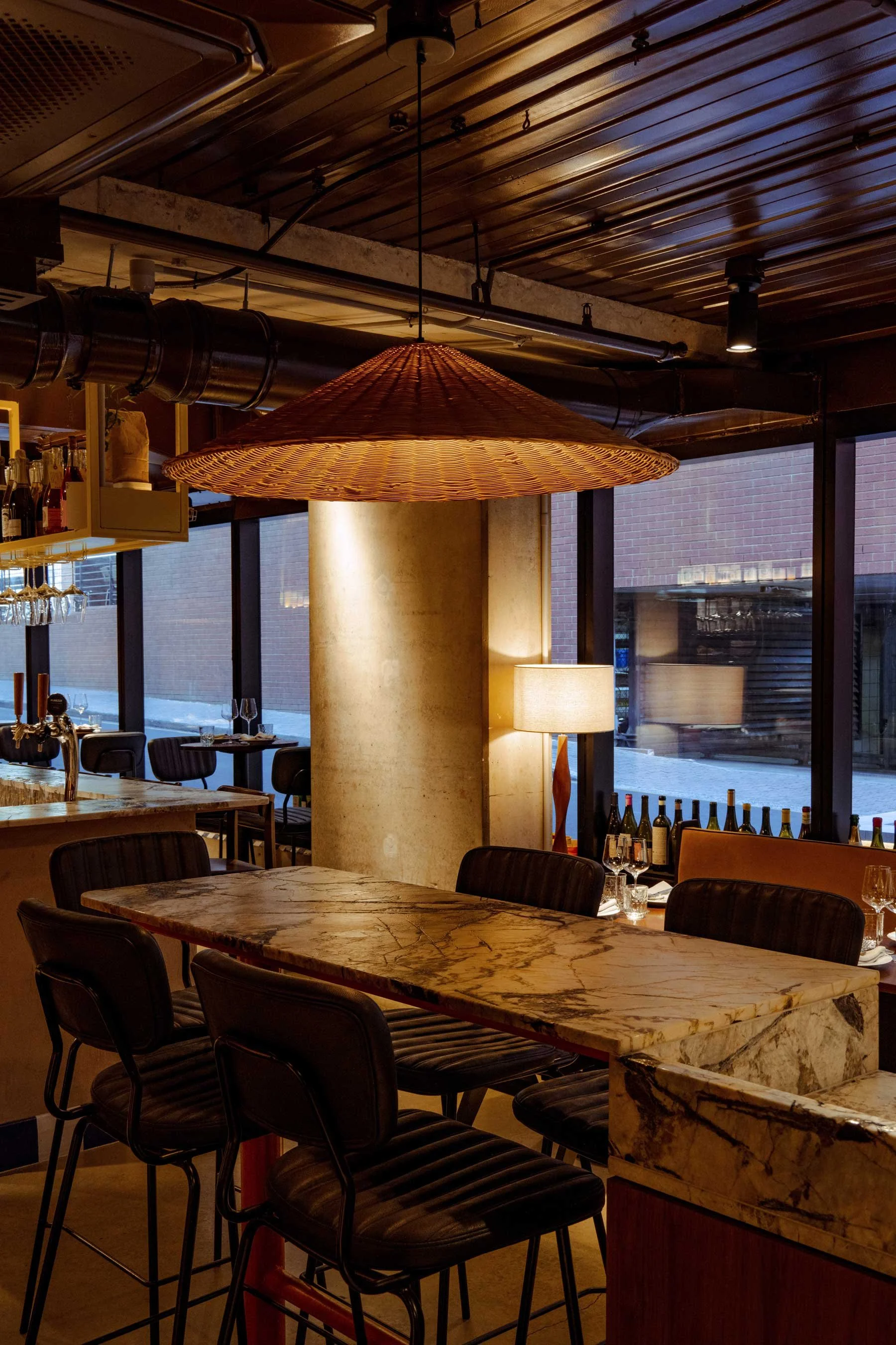 Interior of a restaurant with a marble table, black chairs, a woven pendant light, a floor lamp, and large windows showing a street outside.