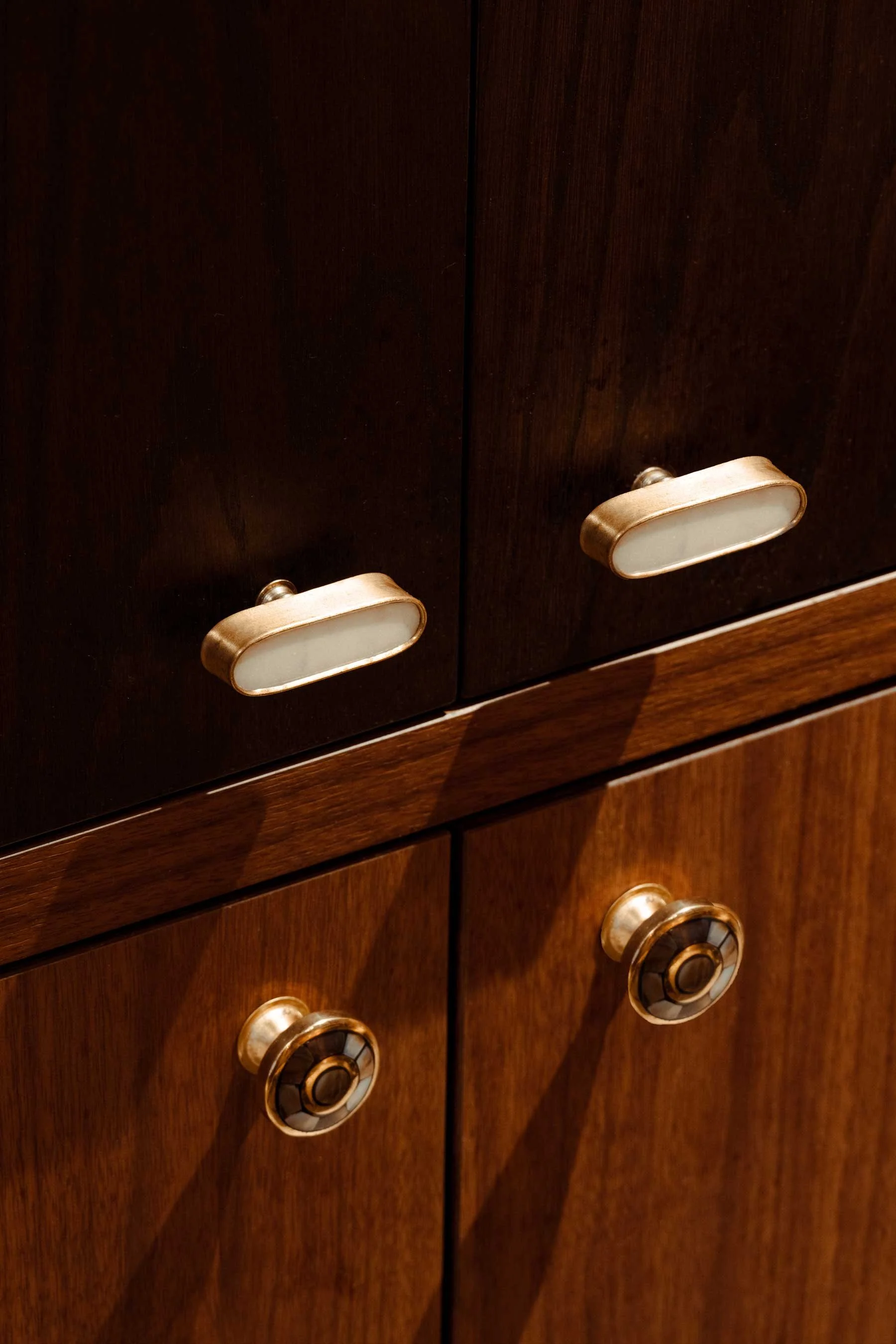 Close-up of wood cabinet doors with vintage brass and ceramic drawer knobs.