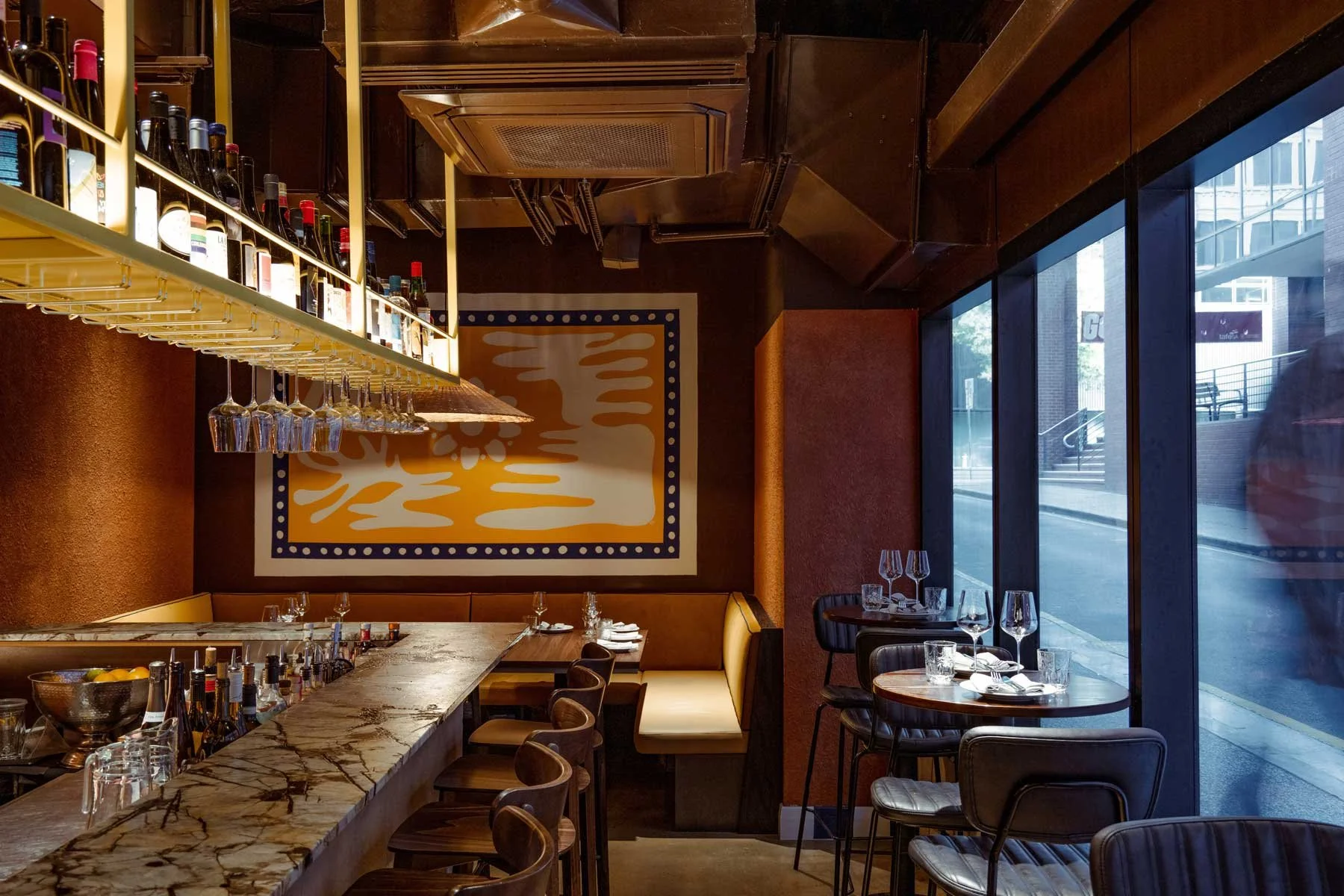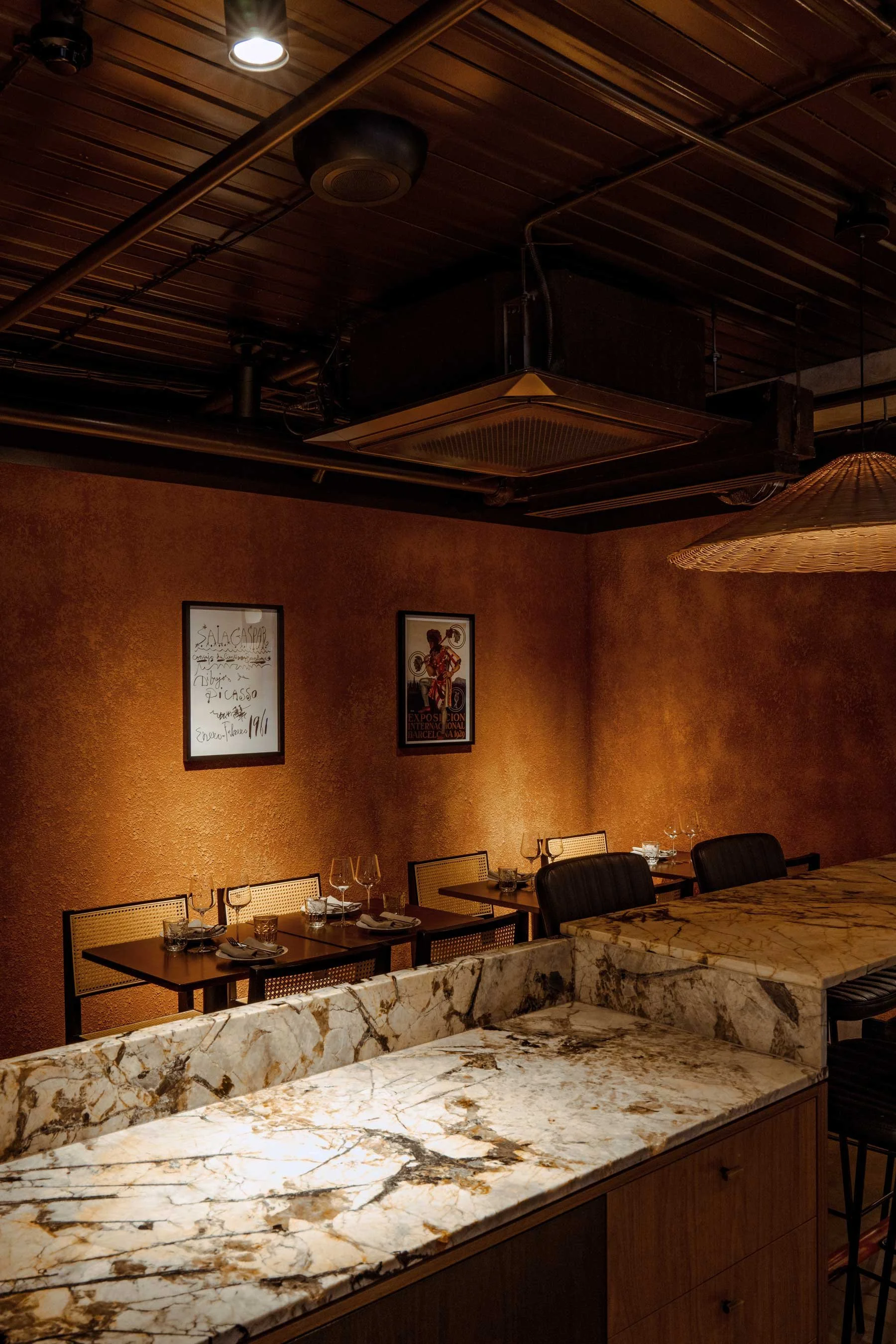 Interior of a restaurant with a marble bar counter, wall-mounted framed art, and neatly set dining tables with wine glasses and tableware.