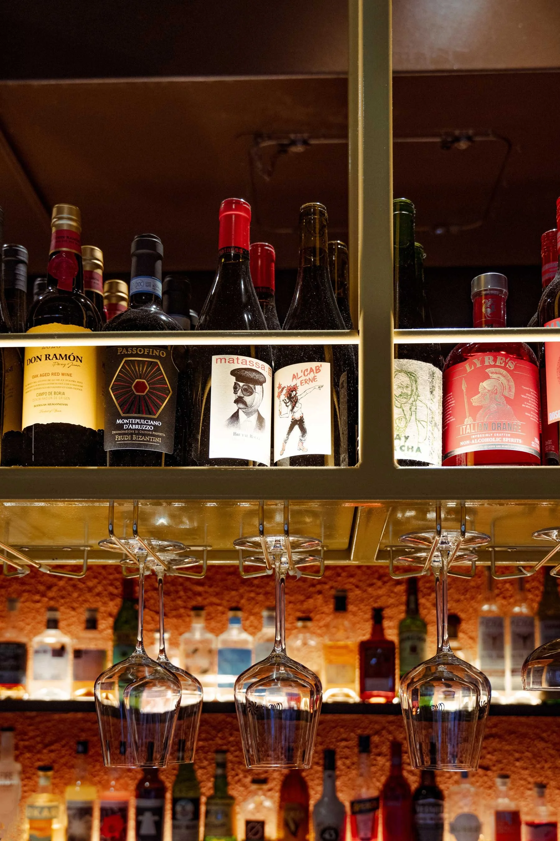 Shelf with bottles of alcohol and upside-down wine glasses hanging beneath
