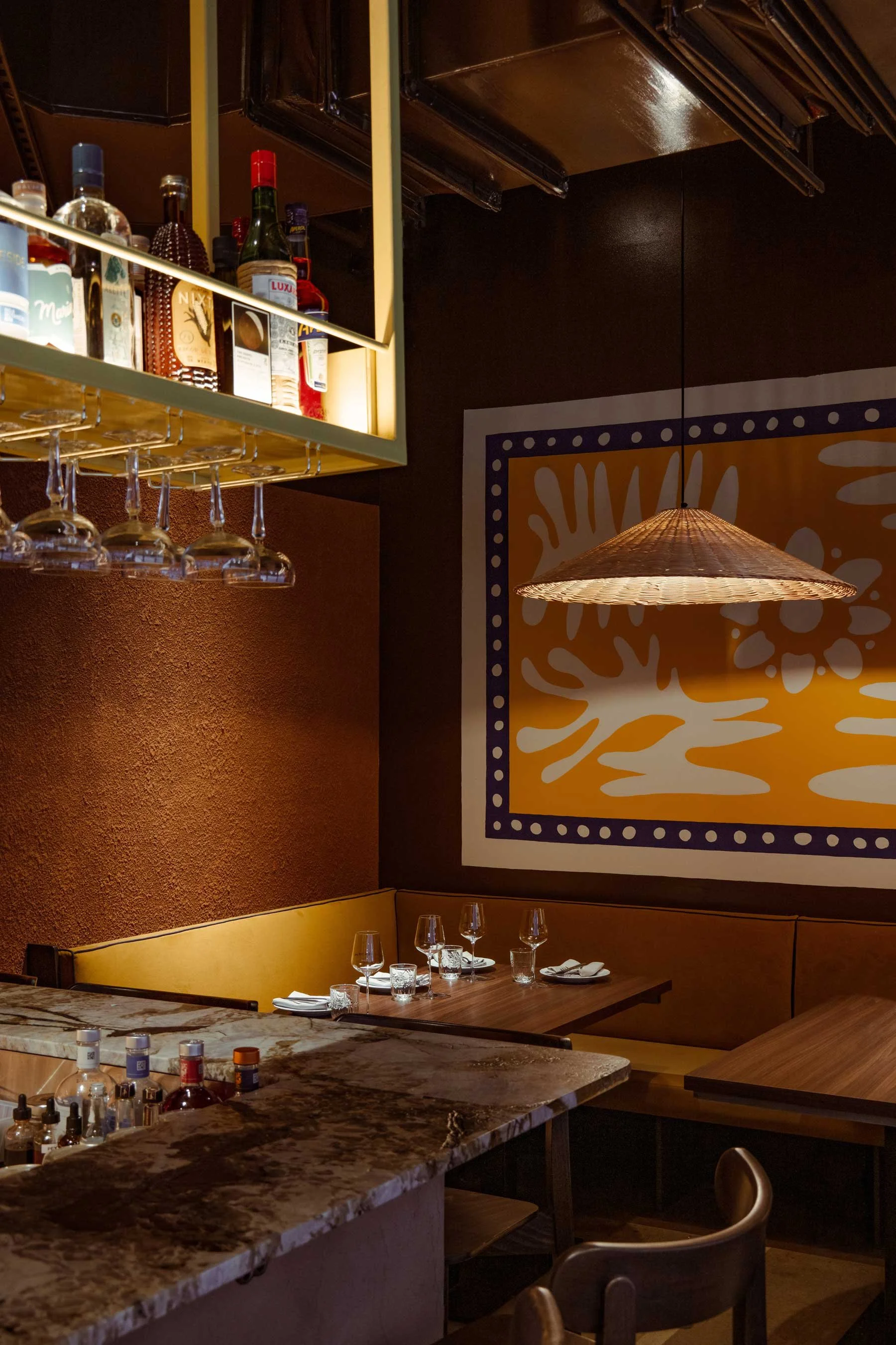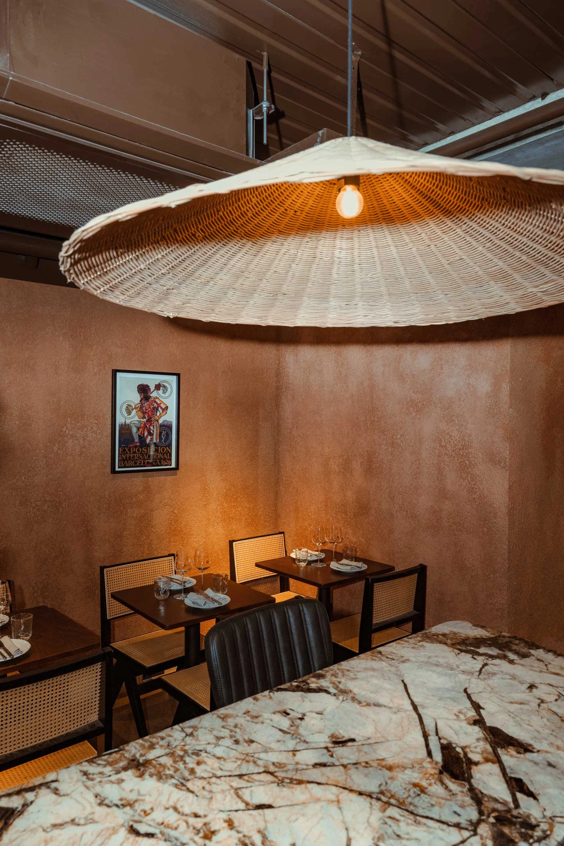 Interior of a restaurant featuring a large woven lampshade hanging from the ceiling, a marble countertop in the foreground, and set tables with wine glasses and plates against a textured peach-colored wall with a framed poster.
