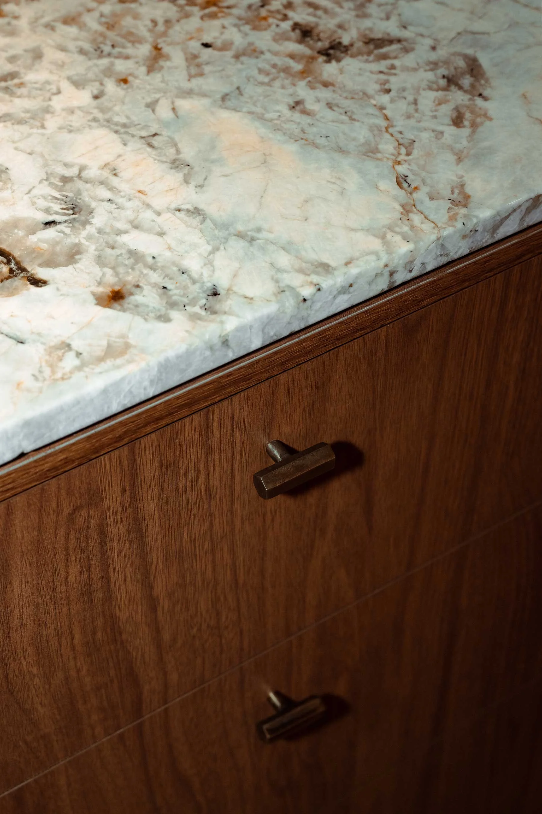 Close-up of a marble countertop above a wooden cabinet with two metal handles.