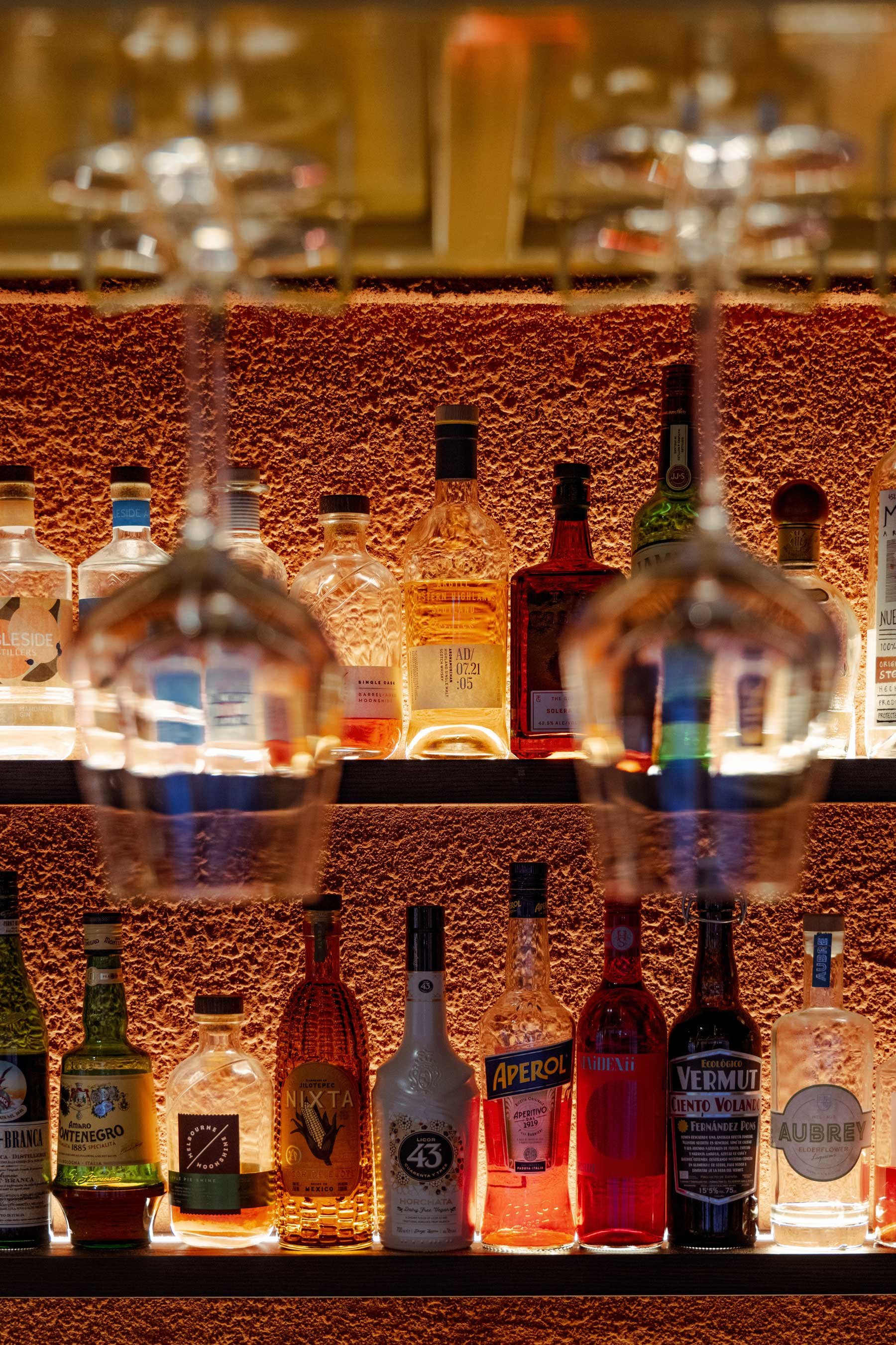 Assorted liquor bottles on backlit shelves at a bar, viewed through hanging wine glasses.