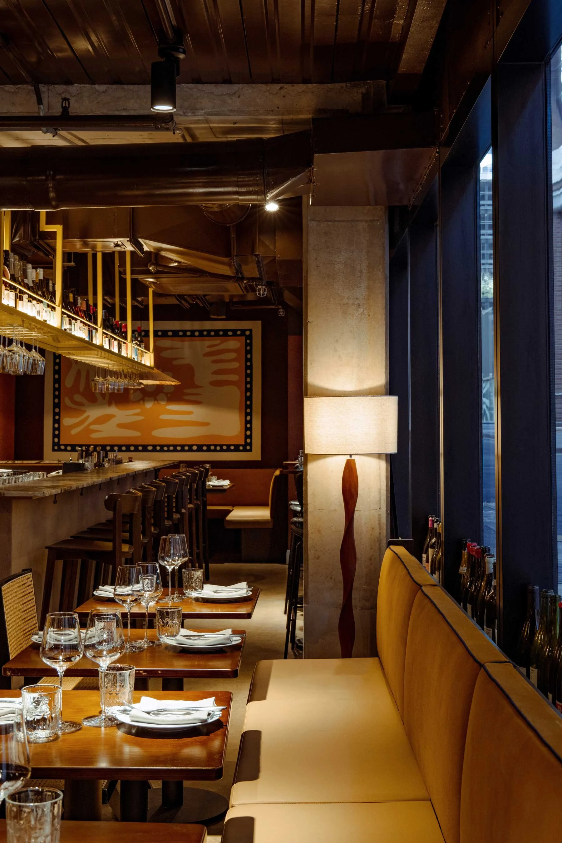 A cozy restaurant corner with a yellow upholstered bench and a small wooden table set with wine glasses and napkins. Overhead, there's a hanging woven lampshade, and on the wall, a large abstract art piece in shades of yellow, white, and purple. A sh