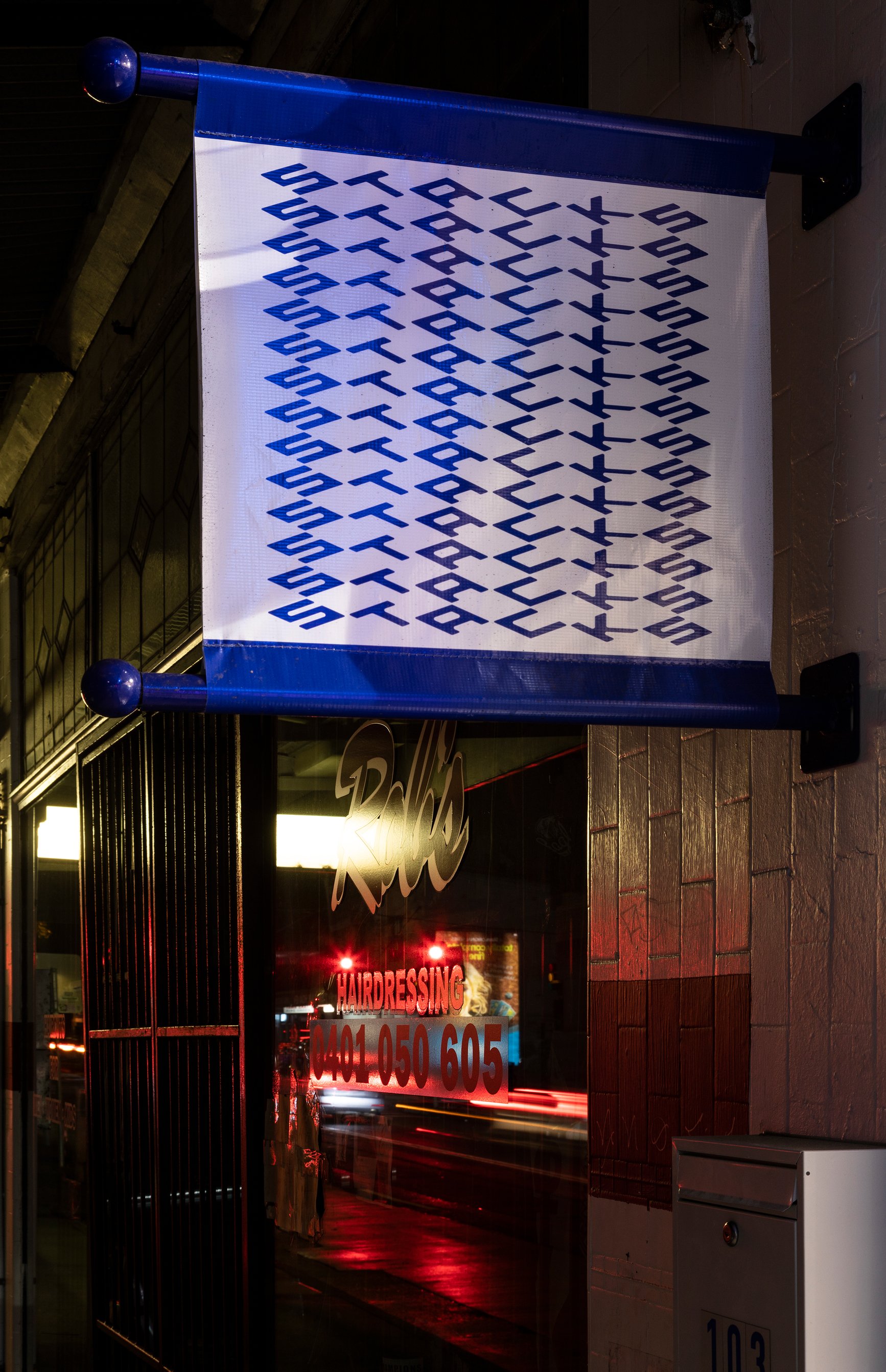 A street view at night showing a store's window with the signage 'Hairdressing' and a phone number. Above, a large vertical banner has rows of blue symbols or logos on a white background, with a blue top and bottom border. The scene is lit by streetl