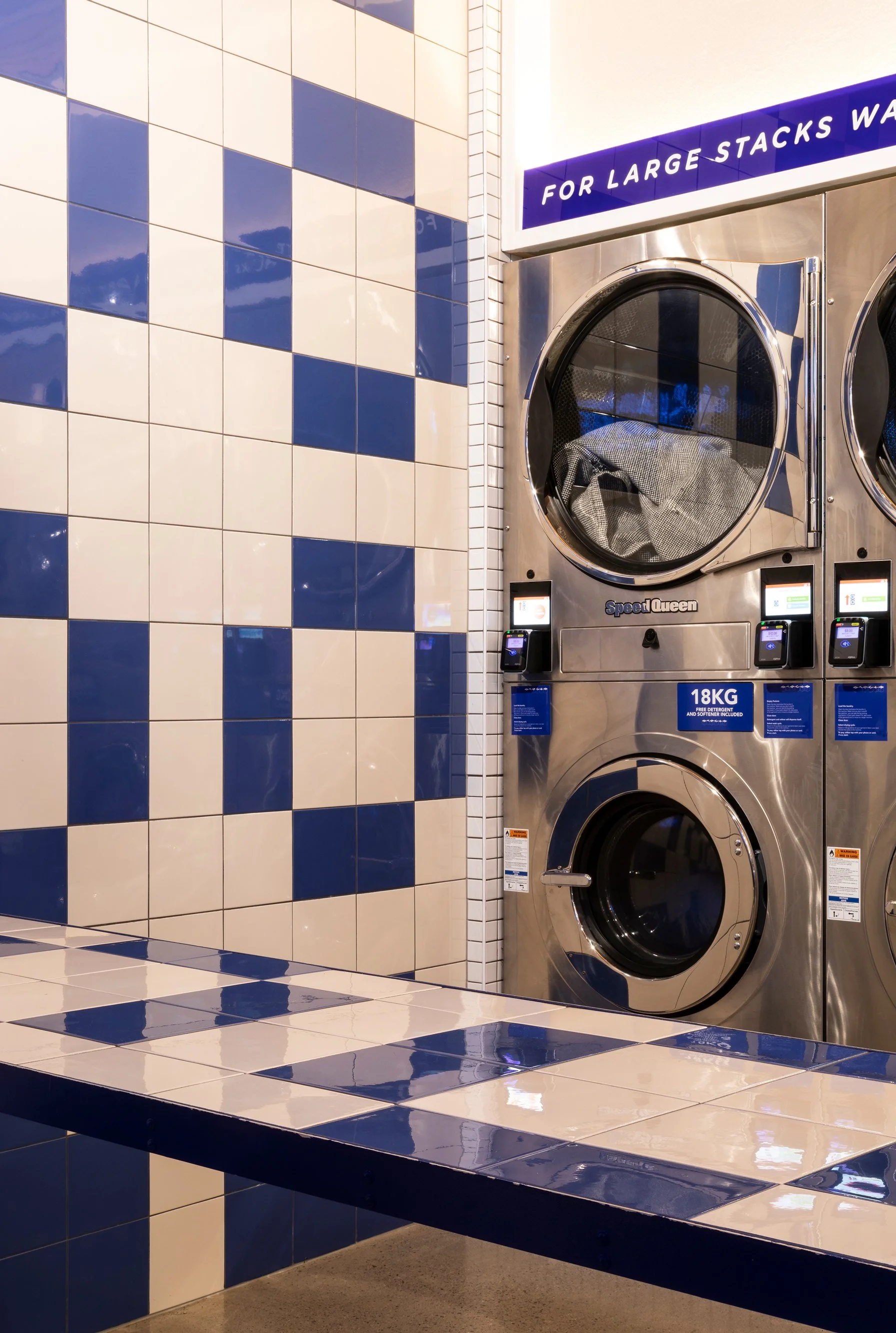 Self-service laundry area with stacked washing machines, blue and white tiled walls, and a tiled bench.