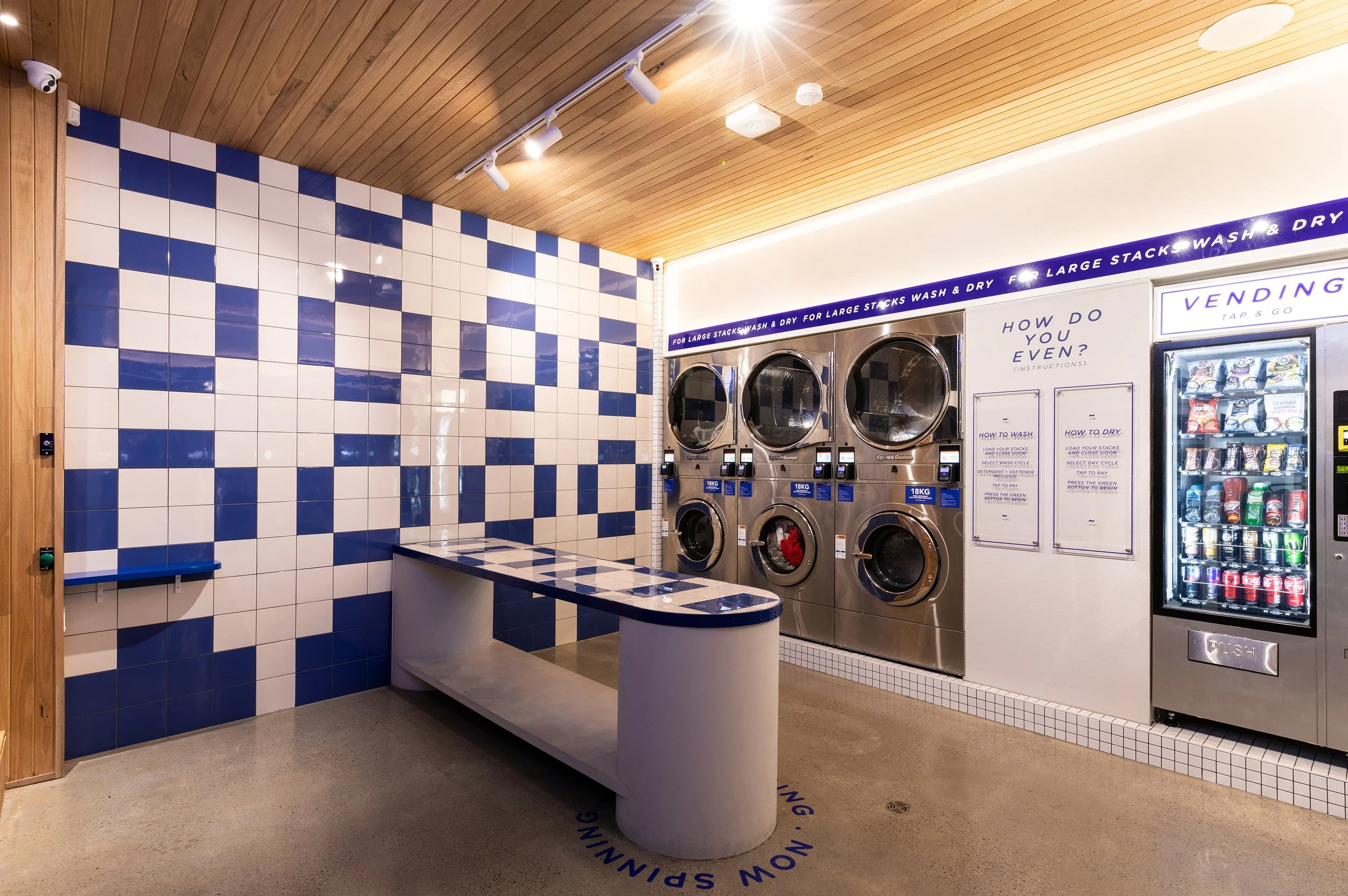 Interior of a modern laundromat with blue and white checkered tiled walls, a white concrete counter with a blue tiled top, and large windows. There is a neon sign in the window and the floor has a circular sign written on it.