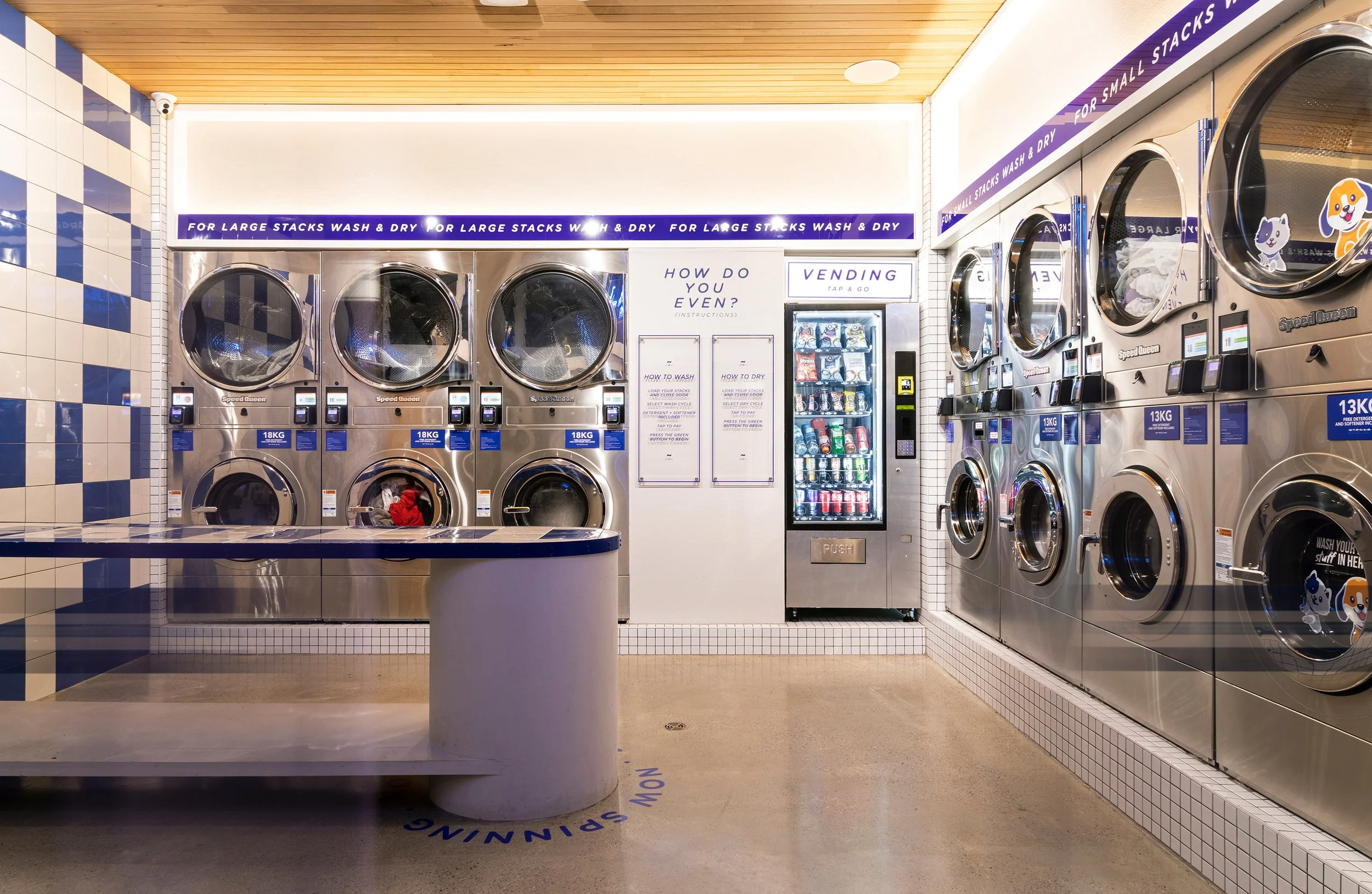 Laundry room with blue and white checkered tiles on the wall, a wooden ceiling with track lighting, and several washing machines and a vending machine for snacks and drinks.